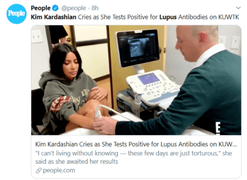 Kim Kardashian said on TV that she tested positive for Lupus and rheumatoid arthritis antibodies. This doesn't necessarily mean she has a clear diagnosis of either disease. It can take years before a clear diagnosis of Lupus or rheumatoid arthritis is made. Psoriatic Arthritis, Lupus, Rheumatoid Arthritis share one gene. It doesn't mean she will have all three conditions, however.