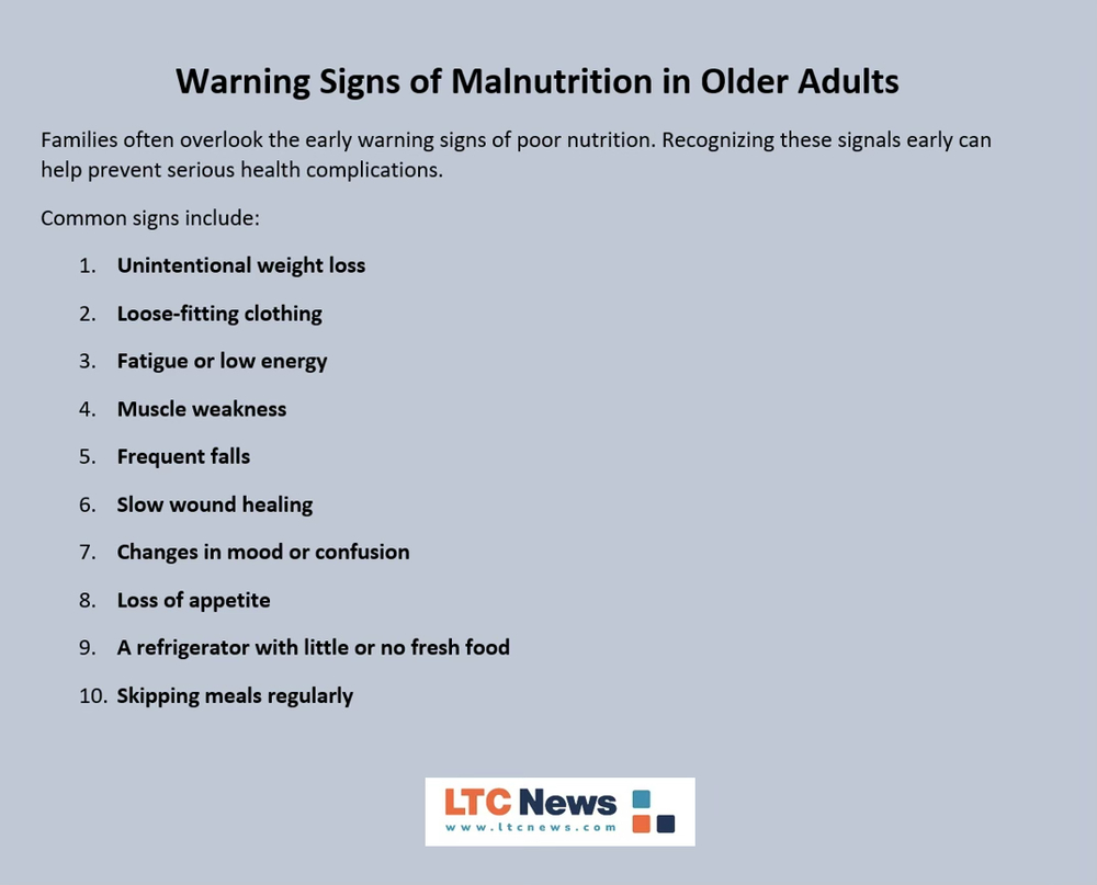 Malnutrition rarely appears suddenly. It usually develops gradually over time. Families should watch for subtle warning signs that an older loved one may not be getting enough nutrition.